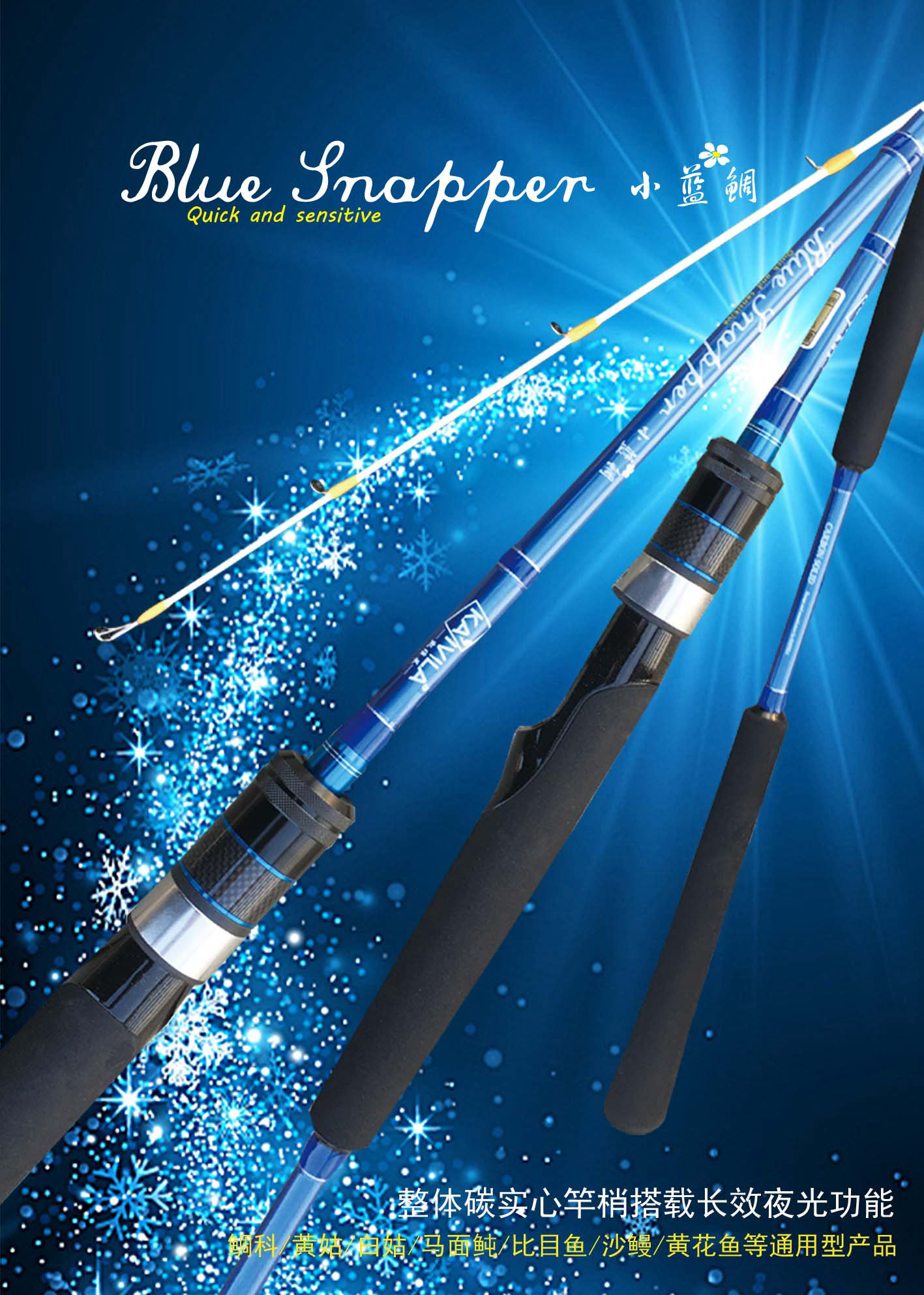研发过程历时六个月,从材料特性到实际施钓反复进行调性调效最终投产。“小蓝鲷”系列近海小船竿,主要针对近海轻口鱼种,设计理念为前梢柔软灵敏,腰力硬挺,咬口信号传导迅速,在纤细的基础上为了保证其设计强度,一号节采用了碳素实心材质。为了实现整体轻巧细致的手感,搭配了微导环配置。前梢部位设置了长效夜光油漆功能,可以充分适应个别鱼种的夜钓环境。